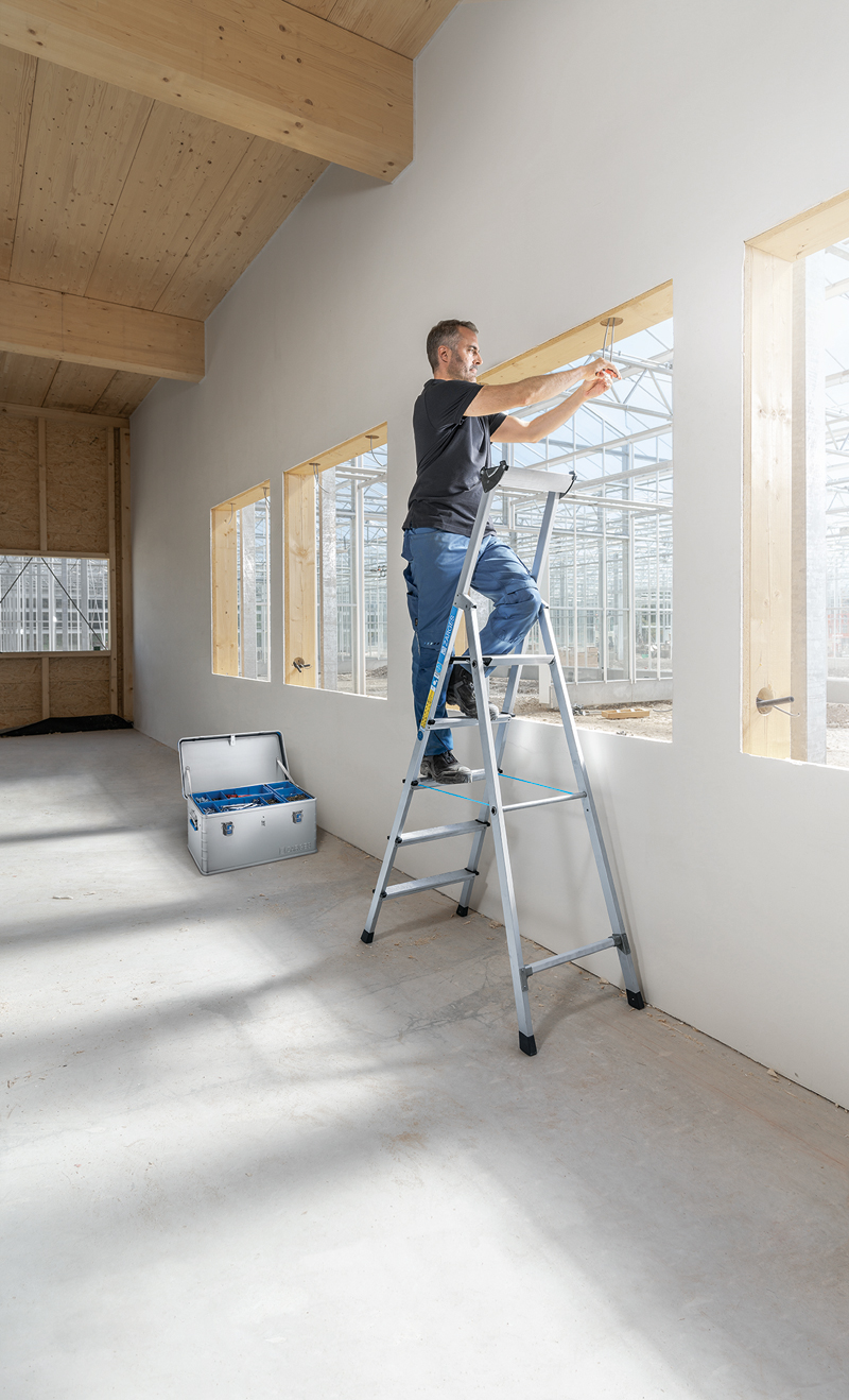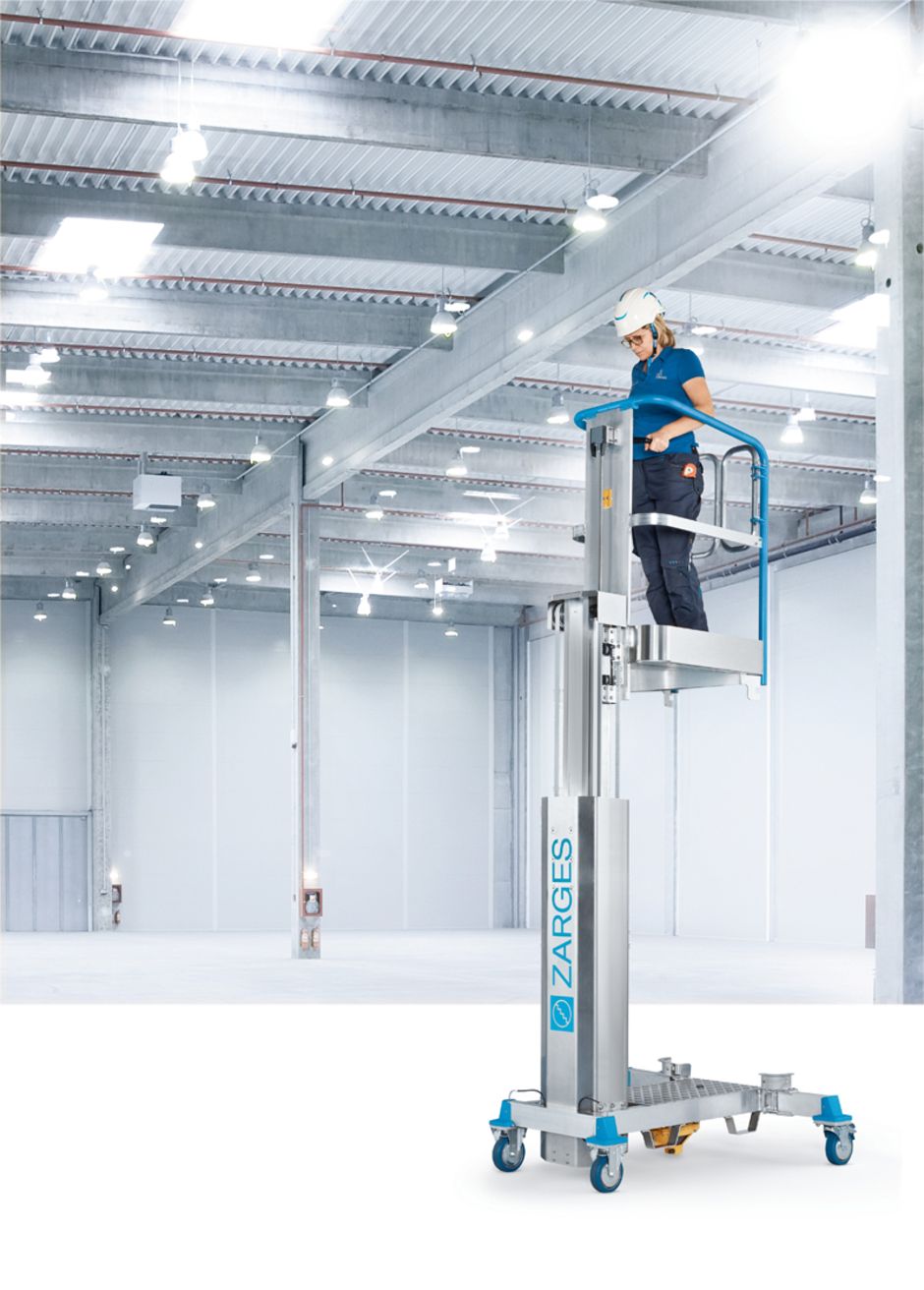 Neben klassischen Hubarbeitsbühnen, wie beispielsweise Lkw-, Anhänger-, Raupen- oder auch Teleskop-Arbeitsbühnen, sind auch Lösungen auf dem Markt erhältlich, die alle Vorteile einer Leiter (mobil und flexibel) mit dem Sicherheitsstandard der Hubarbeitsbühnen kombinieren und nicht auf eine externe Stromversorgung angewiesen sind. So kann beispielsweise der »LiftMaster U« von Zarges autark von jeglicher Stromversorgung per Muskelkraft betrieben und damit auf eine maximale Arbeitshöhe von 4,3 Metern ausgefahren werden. Der Hebemechanismus erfordert einen geringen Kraftaufwand und die zweiflügelige Sicherungstür ermöglicht außerdem einen leichten Einstieg. Danach sorgen ein Korb mit umlaufendem Geländer und der obligatorische PSA-Anschlagpunkt für eine sichere Auf- und Abfahrt und die Möglichkeit, beidhändig Arbeiten durchzuführen. Anders als herkömmliche Bühnen ist der »LiftMaster« laut Hersteller zudem mobil und leicht, sodass dieser auch auf Böden mit geringer Tragfähigkeit eingesetzt werden kann. Durch die Leichtlaufrollen lässt sich der Lift sehr leicht verschieben und durch seinen engen Fahrradius sogar um 90-Grad-Kurven manövrieren. J