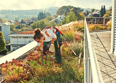 Ist das Arbeitsschutzgeländer aufgebaut, folgt seine Ballastierung durch die Aufbringung des Dachbegrünungssystems. Dränage-, Substrat- und Pflanzschicht kommen auf den lastverteilenden Kunststoffplatten der Pfostenausleger zu liegen und sorgen so für die erforderliche Auflast.