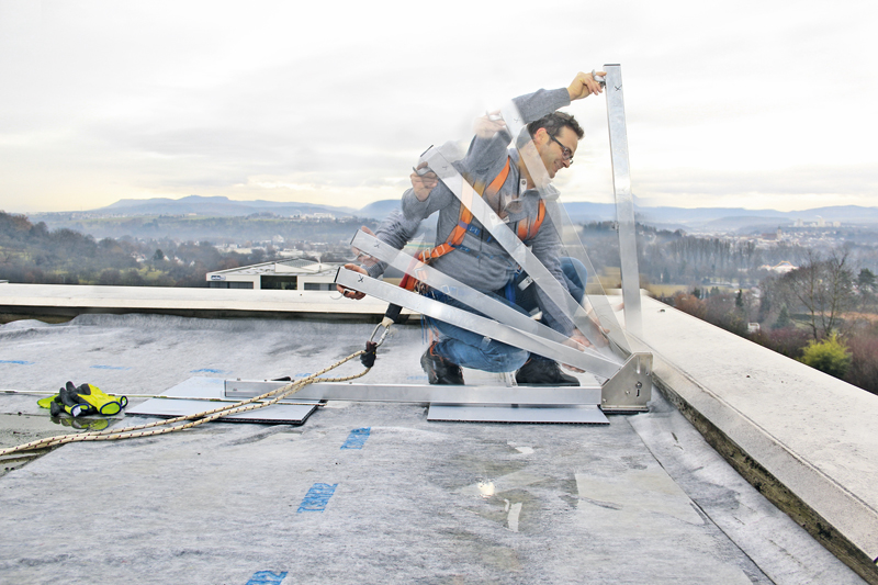 Das kann eine Dachbegrünung sein, die ein- oder zweimal im Jahr zur Pflege begangen wird – übrigens nicht öfter als beim Kiesdach. Darüber hinaus wird das Dach mittlerweile häufig auch zur Platzierung von Lüftungs-, Klima-, und Photovoltaikanlagen genutzt, was automatisch auch Wartungsaufwand bedeutet. So wird das Dach (auch für Unerfahrene) zum Arbeitsplatz, was Arbeitsschutzmaßnahmen einschließt. Bedingt durch die Erfahrung, dass in der Praxis Einzelanschlaglösungen zur Absturzsicherung kaum genutzt werden, führt der Trend nach Ansicht von ZinCo zum Kollektivschutz. Das Unternehmen bietet mit der Neuentwicklung des Arbeitsschutzgeländers »Fallnet ASG« hier dauerhaften Schutz für alle. Dieses leichte und schnell zu montierende Schutzgeländer aus Aluminium benötigt laut Hersteller keinerlei Dachdurchdringungen zur Fixierung.
